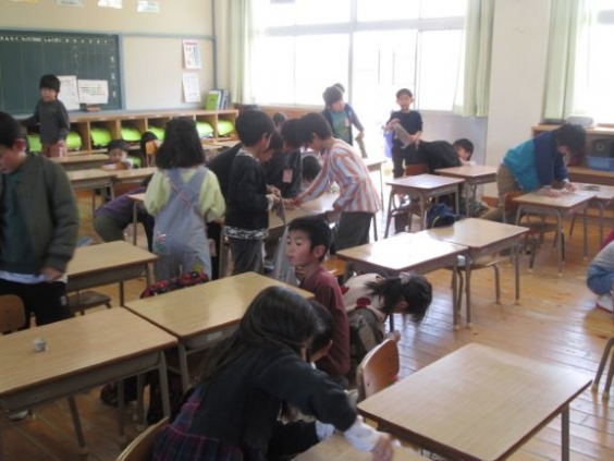 本日掃除の時間に1年間の感謝の気持ちを込めて、全校児童で大掃除をしました。教室、廊下、階段、昇降口、特別教室等、一生懸命掃いたり拭いたりしました。また1年生は、入学式の時に貼ってもたった名前札をはずして机の上を丁寧にふいていました。学校中が心のこもった掃除でピカピカになりました。