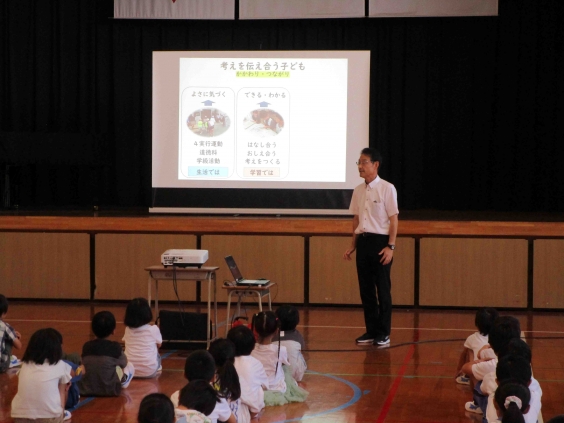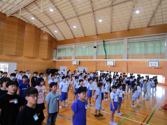 体育館に集合し、後期始業式を行いました。始業式では、本年度の重点目標「考えを伝え合う子ども」に向かって、学習面、生活面、運動面で頑張ってほしいことを話しました。その後、子どもたちは、教室で一人一人後期のめあてを立てています。