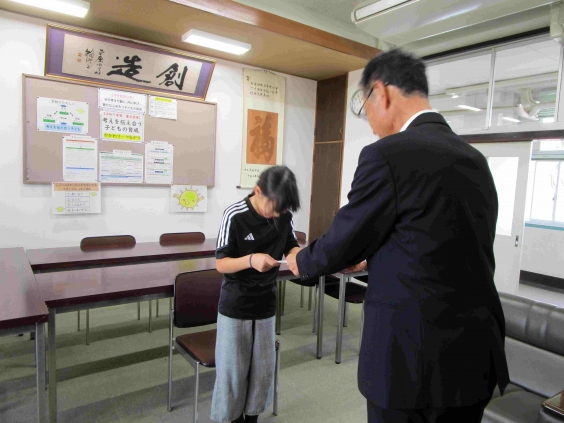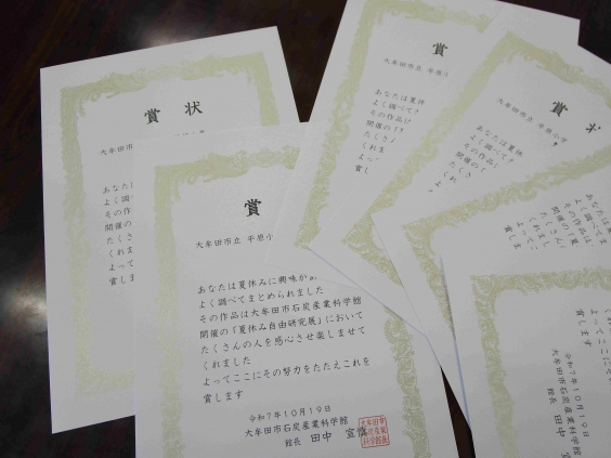 大牟田市石炭科学館で行われた「夏休み自由研究展」に入賞した子どもたちの賞状が学校に届きました。早速、校内表彰式を行いました。 賞状と一緒に撮った写真は、これまでの表彰と同様に児童昇降口付近に掲示しています。学校にお越しの際は、ご覧ください。