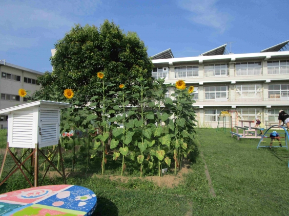 花壇にひまわりの種を蒔き、友達と協力しながら水やりや草取りを続けた結果、大輪の花が咲き、たくさんの種を収穫することができました。