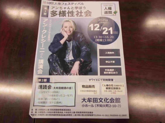 大牟田市でも啓発活動が行われています。12月21日(日)には、大牟田市文化会館で人権フェスティバルが行われます。今年は平原小3年生が取り組んだ「人権の花」の観察記録も展示されるそうです。