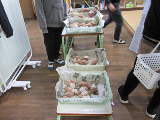 あじさい学級、たんぽぽ学級では、自分たち育て、収穫したさつまいもを仮想の店を設定し、販売する体験を行いました。「おいいしい いもや」の開店です。 お店では、値段の異なるさつまいもをお客さん(職員)に2つ買ってもらうことで代金やおつりの計算をたし算やひき算で出していました。 また、お客さんに挨拶をしたり商品のよいところをアピールしたりとコミュニケーションをとる体験もします。みんな目を輝かせながら活動をしていました。代金やおつりの計算も間違うことなくできました。ありがとうございました。