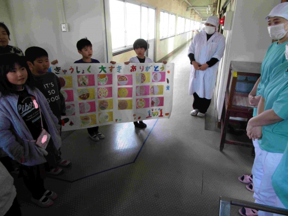 学校給食は、食の重要性を理解し、食に対する関心を高めるための「生きた教材」としての役割があります。 1月29日(木)は、給食週間の一つの取組として、食に携わる人々や食材への感謝の心を表すために、各学級の子供たちから給食調理員の方々にお礼の気持ちを手紙やポスターなどにして届けました。 いつもおいしい給食をつくっていただき、ありがとうございます