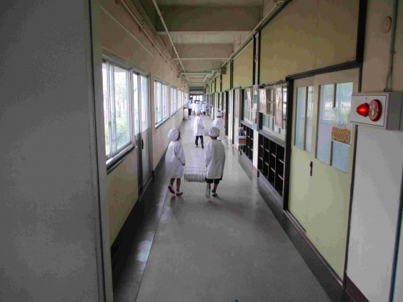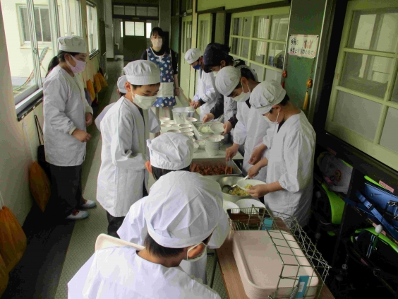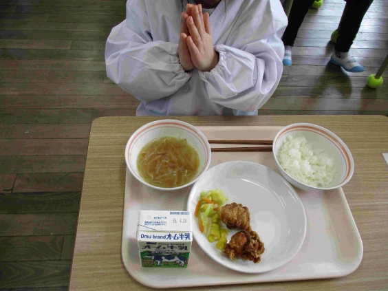 今日、4月17日より、1年生の給食が始まりました。初めてなので、着替え、整列、食器や食管がある場所への移動など、一つ一つ丁寧に確認していきました。配膳は、6年生が手伝ってくれました。1年生は、少しずつできることを増やしていきます。今日の献立は、から揚げ、野菜ソテー、ワンタン汁でした。「もっと食べたい。」という子供が何人も見られ、初の給食をみんなでおいしくいただきました。