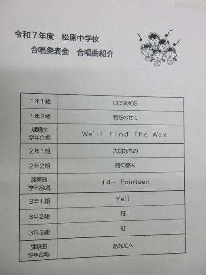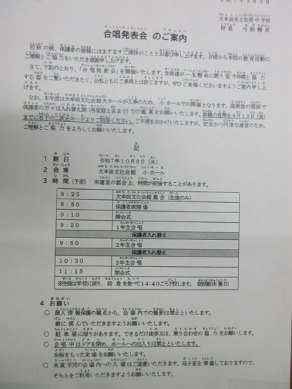 10月8日(水)に松原中学校の合唱発表会があります。 ほしぞら分校から、アンジェロさんが交流で合唱発表会に参加します。 また、ほしぞら分校の生徒さんにも松原中合唱発表実行委員さんから案内状が届きました。 場所…大牟田文化会館 小ホール、開会式…9:10〜です。 時間が許される生徒さんは、ぜひ松原中の生徒さんとアンジェロさんの素敵な合唱を聴きに行ってみてください。