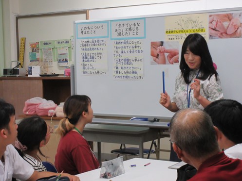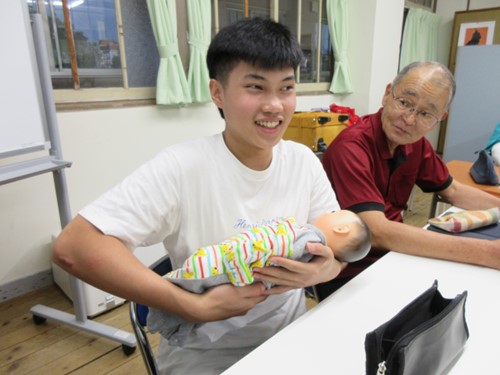 講話では、生命誕生のしくみについて、胎児成長の記録画像や出産動画などをもとに話をしていただきました。また、赤ちゃん人形の抱っこ体験なども行いました。初めて赤ちゃんの抱っこを体験した生徒さんは、ぎこちなく抱かれていましたが、これまでにお子さんやお孫さんを抱かれた生徒さんはスムーズに抱っこをされていました。