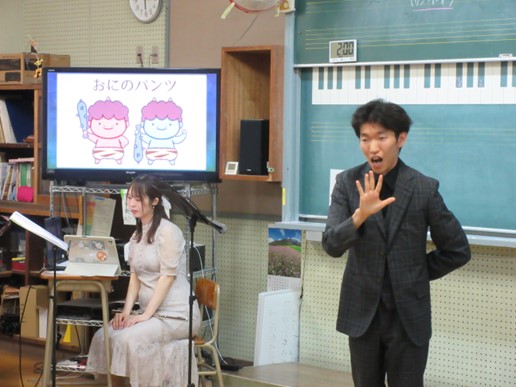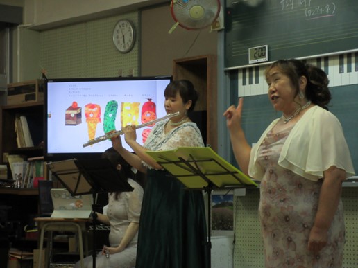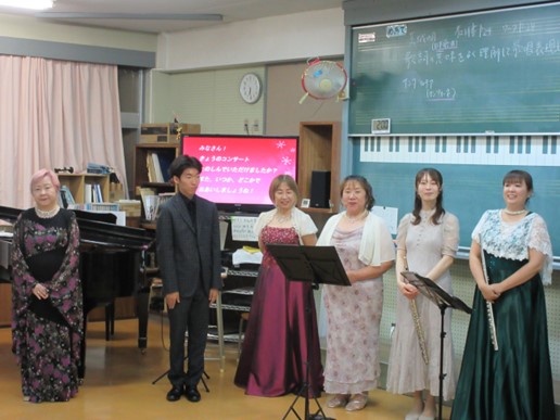 昨日、音楽の授業で「ほしぞらコンサート」を実施しました。 大牟田音楽家協会から6名の方をお招きし、ソプラノとハイバリトンの歌手による歌とピアノとフルートの演奏を鑑賞しました。曲目は、音楽の時間に学習している曲から「荒城の月」などの日本の名曲や小さな子どもも知っているような曲、オペラなどバラえティーにとんだ歌と演奏でした。プロの歌声に感動したり一緒に歌を歌ったりと、とても楽しい素敵な時間を過ごすことができました。
