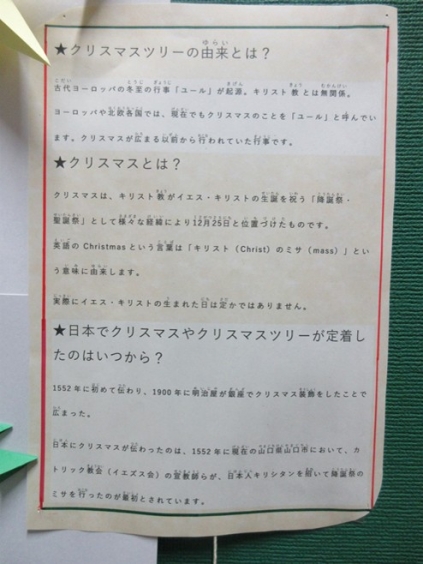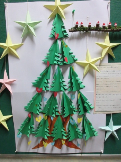 今年もいよいよ残り一ヵ月となりました。市内の各商業施設等は、イルミネーションできれいに飾られ、市民の皆さまを癒していることと思います。 本校も、今月の掲示物には12月らしいクリスマスツリーの掲示物が飾られ、クリスマスの由来なども紹介しています。また、坂本先生からは、自作の寄せ植えの鉢を飾っていただき、職員室の前や廊下を華やかにしています。 今月は、冬のほしぞらまつりも開催しますので、本校へお越しの際には、ぜひ掲示物等もご覧ください。