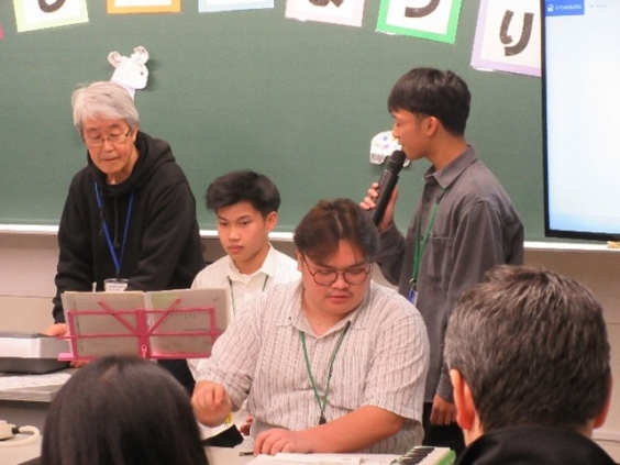 今回のMボードでは、第1部までの様子を紹介します。まず、今回もほしぞらクラブ等で作った布小物や野菜(大根)の販売を行いましたが、今回は先行販売を行い、松原中学校の先生方に交流も兼ねて来校していただき、たくさんご購入いただきました。第1部では、始めに「ほしぞら音楽の夕べ」で音楽の授業で練習した歌や演奏を発表しました。来校していただいた方も参加していただき、音楽を楽しむことができました。その後、ほしぞらツアーの発表会を行いました。生徒さん一人一人がツアーの感想を述べ、楽しかった思い出を振り返ることができました。