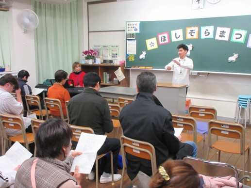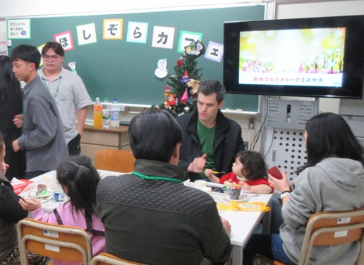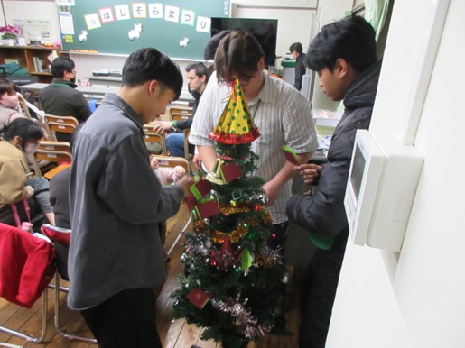 第2部は、まずクイズを行いました。ほしぞら分校に関係する内容をクイズで出題し、参加者全員で答える内容でした。生徒さんが問題を考え、司会進行しました。次に、クリスマス前ということもあり、願い事のカードを作成し、クリスマスツリーに飾りました。生徒さんや職員、参加された方も、それぞれの願いを考えツリーに飾りました。その後、ほしぞらカフェの時間を設定し、親やケーキなどを食べながら楽しいひと時を過ごしました。家族や友人、先生方、市役所の方、質問教室の方など様々な方と触れ合い、楽しくおしゃべりすることができました。最後に、参加者全員で「おめでとうクリスマス」の歌を一緒に歌いました。外国籍の方も歌えるように多国籍バージョンで歌いました。