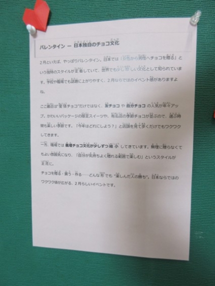 今月の掲示物に、特別版が掲示されましたので紹介します。 2/14はバレンタインデーです。この日は、大切な人にお菓子やプレゼントを贈って、感謝や愛を伝える特別な日となっています。日本では、女性から男性に贈るのが一般的ですが、他の多くの国では男性から女性にチョコレートやバラの花束、アクセサリーなど様々なものを贈るそうです。 掲示物には、チョコレートに関する豆知識やチョコレートの種類、日本独特のチョコレート文化について紹介しています。 こちらもご覧いただければ幸いです。
