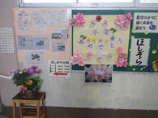 本日、18:00より大牟田市立宅峰中学校ほしぞら分校第1回卒業証書授与式が行われます。ほしぞら分校初の卒業式ということもあり、準備もどのようにして良いか試行錯誤しながら準備しました。もうずぐ卒業式が始まります。 卒業する生徒さん、おめでとうございます。素敵な卒業式になるように生徒さんと職員一同で頑張りましょう。