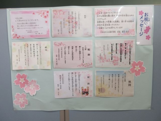 教頭 三浦です。 在校生と新入生および先生たちで、入学式の準備を行いました。 まずは、掃除! 掃除機でごみを吸い取った後、水拭きを行いました。 みんな力を入れてゴシゴシきれいにしてくれました。 そのあと、式場準備をしました。 祝詞(お祝いのメッセージ)を張り付けたり、受付は、多言語(いくつかの外国語)で表示したり、黒板にメッセージを表示したりしました。 新入生のみなさんが喜んでくれるとうれしいです。