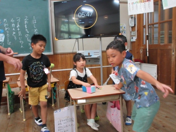 パーティー会場にやって来た1年生は,2年生とふれあいながらゲームを楽しみました。終了の合図が鳴ると「もっとしたいです!」「楽し過ぎた!明日もさせてください!」と言っていました。おもちゃパーティーは大成功でした。