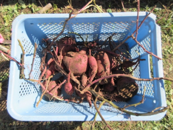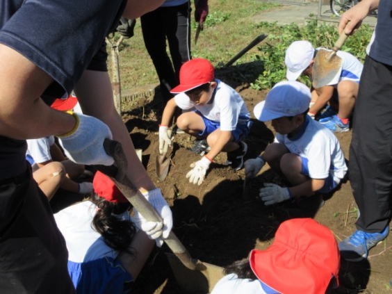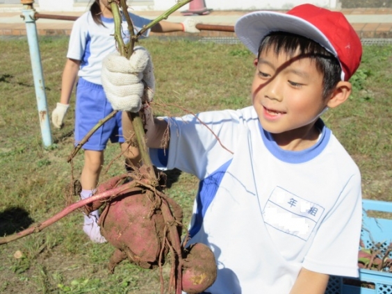 5月に植えたサツマイモを1,2年生が収穫しました。大きく育ったサツマイモを見て児童はびっくり!「大きすぎて引き抜けない!」「うわー!僕の手より大きい!」と観察しながら収穫しました。とてもわくわく楽しそうでした。 今後はいろいろな調理をして,おいもパーティーを開きます。地域のゲストティーチャーの皆様のおかげで,貴重な経験ができました。ありがとうございました。