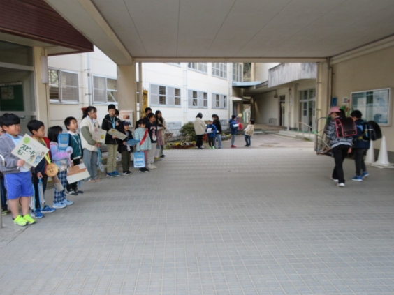 上内小では進行委員会が企画して行う挨拶運動を定期的に行っています。これには全学年から希望者が参加します。今日は全校児童の半数が参加して,朝早くから「おはようございます!」と大きな声を響かせました。登校してきた児童も元気に挨拶を返していました。 「SMILE(笑顔)」「SPEED(自分から)」「STOP(立ち止まって)」そして相手の目を見ての挨拶は,上内小の自慢です。