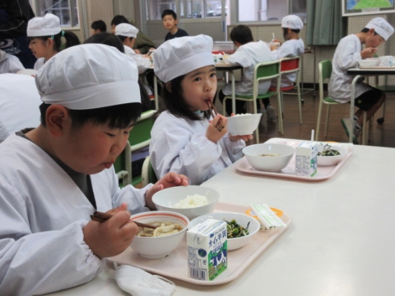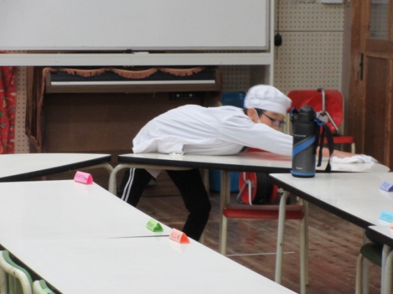 縦割りグループで食べるこの機会を,上内っ子は楽しみにしています。このような取組ができるのは6年生のおかげです。下級生が来る前に,テーブル設営,名札の配置,そして丁寧に吹き上げてくれます。 6年生と一緒に楽しめる縦割り給食も今回が最後であったため,下級生は感謝の気持ちを込めて会食しました。