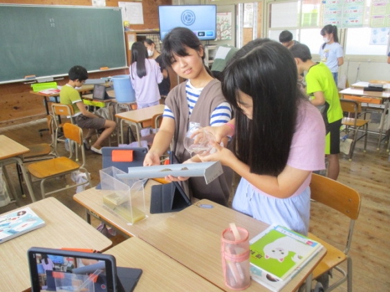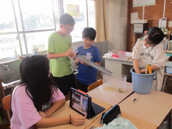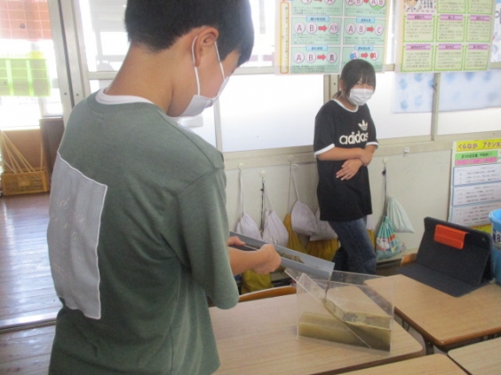 6年生の理科では、身近な土地のつくりと変化について学んでいます。その一つに地層(ちそう)のでき方です。 地層とは、土や砂、火山灰などが積み重なってできた「大地のしま模様」です。まるで地球の歴史が記録された本のページのようなもので、一つ一つの層が過去の出来事を教えてくれます。 子どもたちは、水槽を使った実験を通して地層ができる仕組みを体感しています。 何度も繰り返し実験することで、幾重にも地層を作っていました。みんなで協力しながら、砂や土が堆積していく様子を真剣に観察しました。