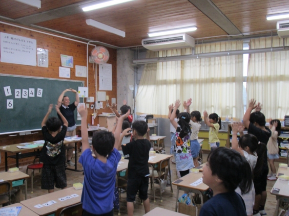 「ワン ツー スリー フォー ファイブ シックス セブン、・・・」とリズムに乗って歌ったり、ジェスチャーを交えて発語したりしながら表現に慣れていきました。次には、数カードを使い、引いた数字の分進むことができる双六をして楽しみました。引いたカードの数を英語で唱え、その分進んで、その場所の数や果物を英語で言いながら楽しく活動しました。時々、止まったところが動物のものまねのをするお題となっており、笑顔や笑いがたくさん見られ、とても雰囲気のいい学習でした。