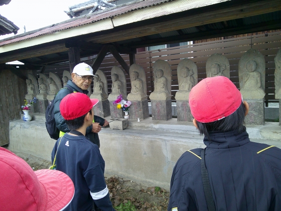 今日、5年生は総合的な学習の時間「倉永ふるさと再発見」の学習で、地域の原田さんをはじめ、4名の方と一緒に校区の史跡や遺跡等をめぐり、地域の宝と言えるものや場所をたくさん知りました。