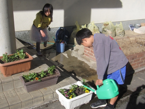 地域の方々から、お花の苗をたくさんいただきました。このお花の一つ一つに「倉永小学校を、大牟田で一番美しい学校にしよう!」という地域の方々の願いが込められています。 いただいた苗は、子供たちと一緒に校内の花壇やプランターに植え、お花の水やりも、子供たちが進んで行っています。また、プランターに植えた分は、正面玄関や児童昇降口に飾りました。正面玄関は、お城の入り口のようにおしゃれになりました! ご来校の際には、ぜひご覧ください。地域の皆様、素敵なお花をありがとうございました!