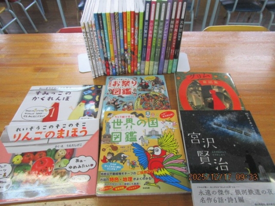 公益財団法人 日本教育公務員弘済会 福岡支部より、子供たちの読書活動に役立てて欲しいと助成金5万円をいただきました。 早速、司書の赤木先生に、子供たちがリクエストしている本を注文してもらい、約30冊の本が届きました。新しくて綺麗で、どれも読みたくなる本ばかりです。 現在、倉永小学校では、冬休み前の図書館の本の整理期間です。貸し出しができるまで、あと少しの我慢、楽しみに待っていてください!!