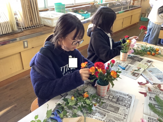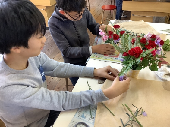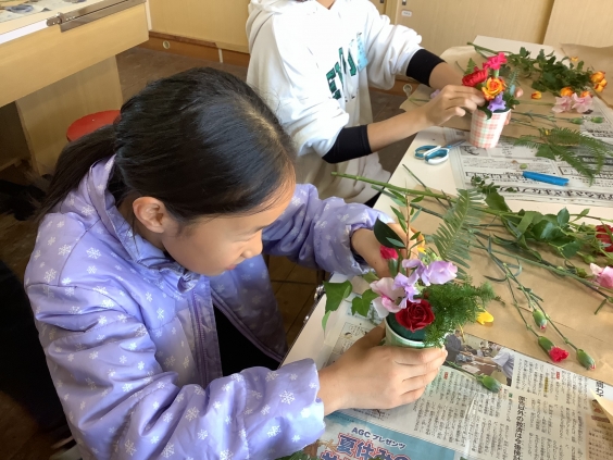 華道連盟の皆様には、今回の体験用にカーネーションやバラ、アイビーなど、とてもきれいなお花を準備していただきました。子供たちは、先生方にコツを教わりながら、お花を生けていきます。「バランスが難しいなあ。」と華道の難しさを感じながら、草花と触れ合い、思い思いの作品を夢中になって制作しました。