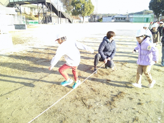 また、低学年は上級生と同様にせず、ゆっくり回るなわに入ったり、なわの跳び越え方のコツをつかんだりできるよう、簡易の場でたくさん慣れる活動をしています。早く上学年の中に入って一緒に跳べるようになろうと取り組んでいます。