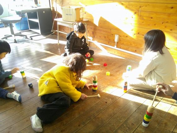 けん玉やだるま落とし、めんこ、おはじき、お手玉、あやとりの6つを体験し、みんなで楽しく活動しました。けん玉名人と言えるぐらいの子や、必死になってめんこをひっくり返そうと投げる子、互いに教え合いながらあやとりをする子、それぞれが相手を思いやりながら楽しく活動することができました。