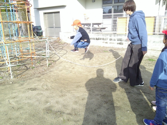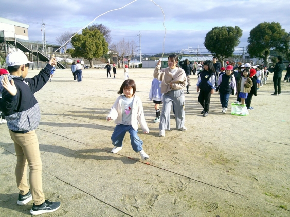 この冬場は縦割り班で長縄に挑戦してきました。3年生から6年生までは、8の字で跳んでいきました。1,2年生は段階を踏みながらレベルを上げてクリアしたら次の学年のグループに参加していきました。