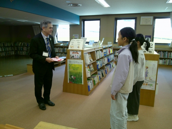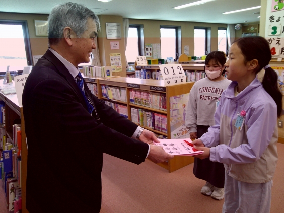 一年間たくさんの本を借り、楽しく読書活動ができたことへの感謝の思いをみんなで手紙に書き、図書委員会の部長と副部長の児童が代表で、市立図書館の館長さんへお渡ししました。