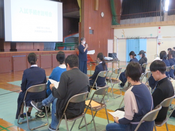 本日11/8(土)午前中、土曜授業として、3年生は高校入試手続きに関する説明会を実施しました。 本年度から公立高校のWeb出願が始まるなど、高校入試の制度が毎年変化しています。 子どもたちの進路保障を確実行うためにも、生徒、保護者そして学校が情報共有をしっかり行い、生徒たちには、入試を頑張っていただきたいと切に願います。