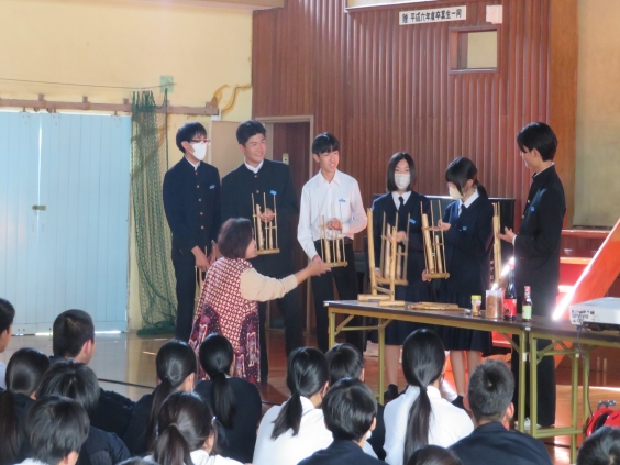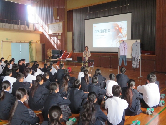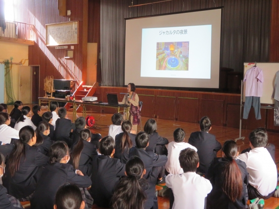 11/14(金)(期末考査最終日)5限目、国際理解教育を実施しました。 講師の石橋ヘルミンダワティ先生(インドネシア出身)には、事前に1年1組と一緒に給食を食べていただき、給食交流も実施しました。 5限目には、全校生徒がインドネシアの食と民族衣装などを通して、異文化理解と共生を踏まえた国際理解を進めることができました。