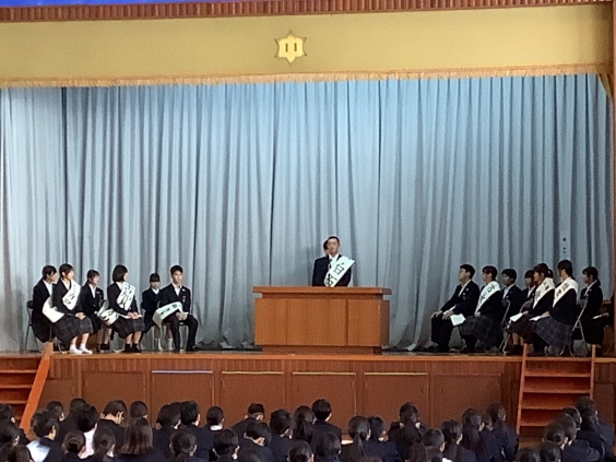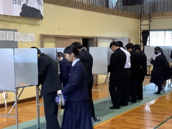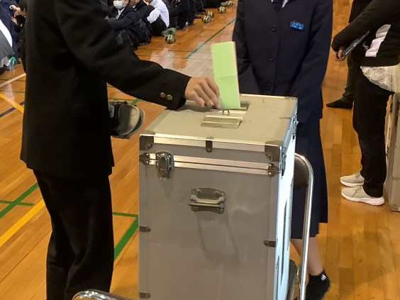本日11/27(木)午後、生徒会役員選挙立会演説会・投票を行いました。 1年生から1名、2年生から3名の生徒会役員が選出されます。 それに対して、立候補者は1年生3名、2年生5名の計8名です。 各候補者がしっかりと公約を紙面と口頭で伝えることができました。 投票は、市の選挙管理委員会から本物の記載台と投票箱をお借りし、投票用紙も本人確認をして必要の投票用紙を投票者に渡すなど、本物の選挙同様に実施していました。 おって後日、新生徒会役員の発表予定です。