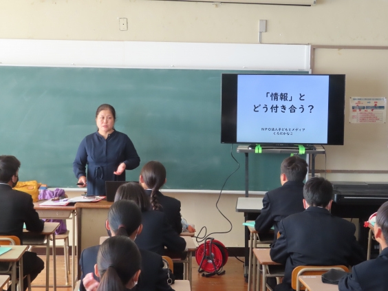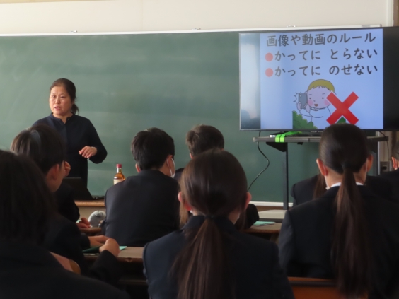 12月10日(水)、1年生対象に「保護者と学ぶ児童生徒の規範意識育成事業」に伴う研修会を実施しました。 本日のテーマは、「情報モラル」 講師は、NPO法人子どもとメディア 公式インストラクター 黒田加奈子先生 保護者とともに、スマホやSNS等の利用について学ぶことができました。 本講座をきっかけに、適切な利用を行い、トラブル等を回避してほしいものです。