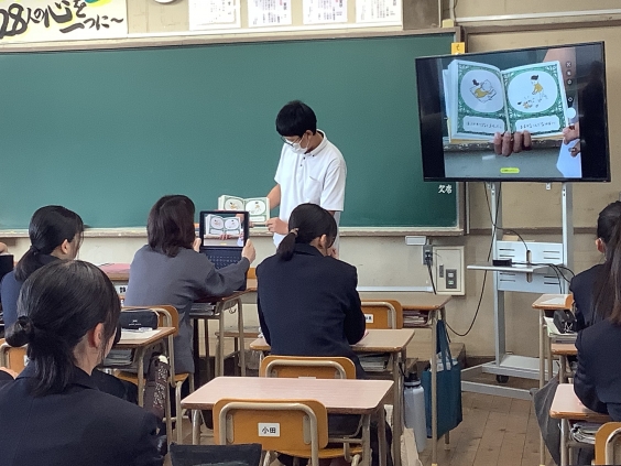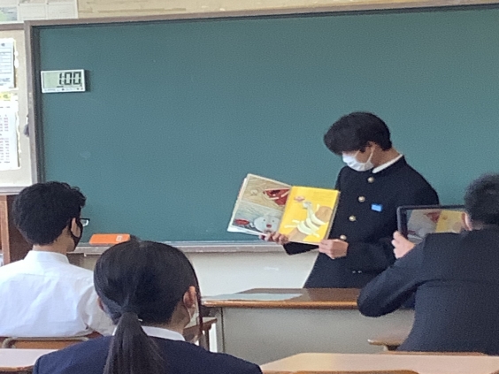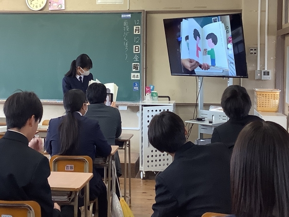 本日(12/12)朝の自習時間を活用して、生徒会の学級の学習文化委員会による「読み聞かせ」が2・3年生で行われました。1年生は後日実施します。 1学期にも同様の取組を行いました。 自分で読むことも大変ですが、学級のみんなに「読み聞かせ」を行うことはとても配慮が必要な取組です。 絵本の内容が皆さん伝わるように、絵本をモニターに映す工夫をした学級も見られました。