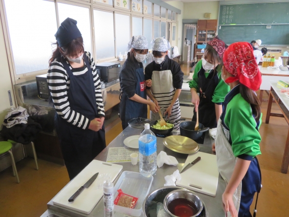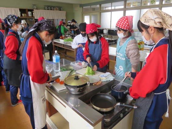 先週2/7(土)11時から、大部栄養教諭をメイン講師として、給食人気メニューの料理教室を開催しました。 事前に申し込みをした生徒など20名ほどが参加しました。 メニューは、おにぎり、魚の辛子マヨネーズ焼き、ニラ玉スープ、おかか炒め、ワインゼリーです。 「簡単!」ではあるものの、しっかりと調理体験プラス「おいしい」体験を楽しむことができました。