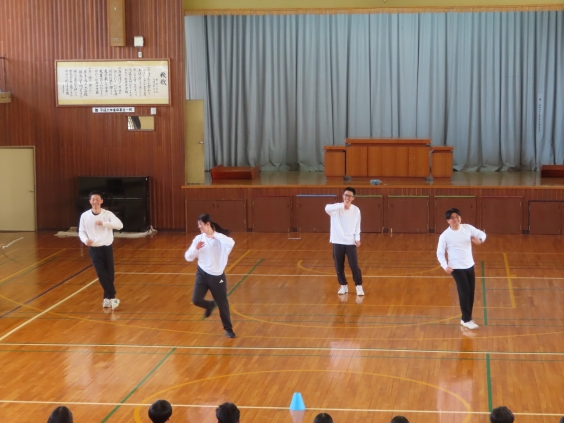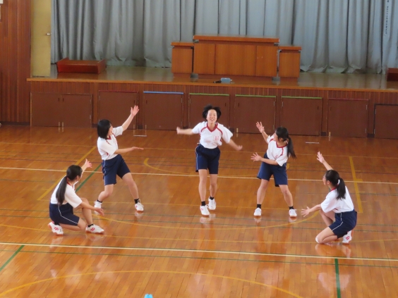 本日17日(火)午後、1・2年生のダンス発表会を行いました。 5名程度のグループでこれまで練習したダンスを発表してくれました。 総数は22チーム。 各グループ、それぞれの個性を出した素敵なダンスを披露しれた発表会となりました。 追伸:松原中職員によるグループ“嵐?”も参加し、ダンス発表会に花を添えてくれました。