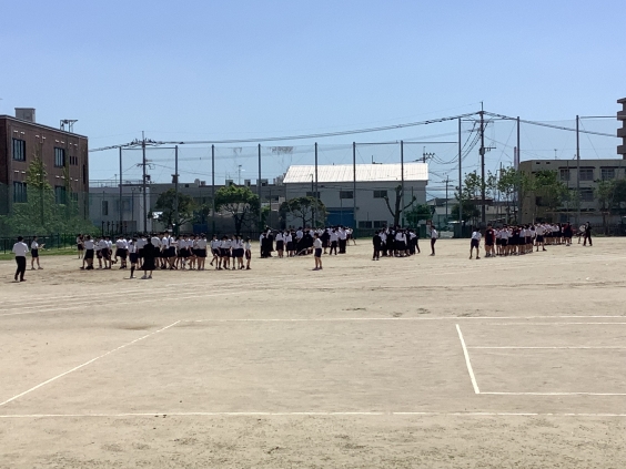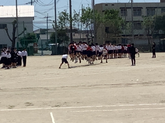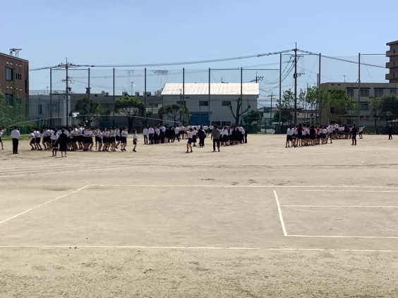 4月16日(木)昼休み、全校生徒がグラウンドで、学級ごとに「大縄跳び」の練習開始!