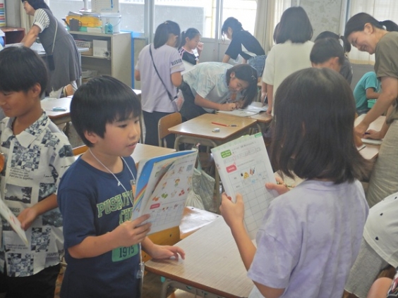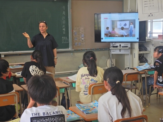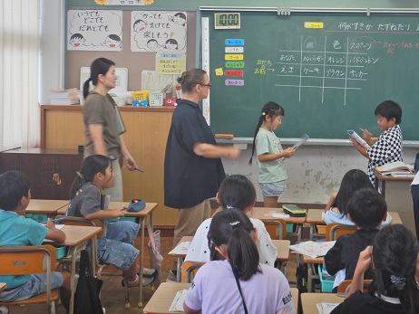 今日(9月17日)は、リンダ先生と一緒に英語の学習をしました。 3年生では、食べ物やスポーツ、色などいろいろなカテゴリーの中で、何が好きかをインタビューし合いました。1人に3つは質問しないといけないのですが、子供達は慣れた様子で次々と楽しそうにインタビューしていました。 5年生では、can や can’t を使って自分のできることやできないこと、友達ができることやできないことを発表しました。very well やfast なども上手に使えていました。
