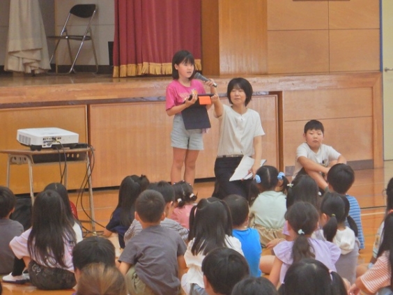 また、通学合宿では、お家の人や先生がいなくても礼儀正しく、あいさつもきちんとできたことなど、地域の方からお話を聞いて嬉しかったこと紹介しました。