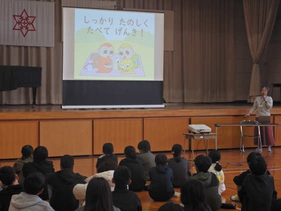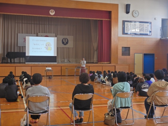 今日(10月30日)は、子どもとメディアの江頭久美様にお越しいただき、5,6年生と保護者の方にメディアとの正しい付き合い方についてお話いただきました。スマートフォンやゲームには依存性があることやSNSに潜む危険性等について、実際の事例を挙げながら話してくださいました。自分の体を守るためにできることとして、睡眠の質をよくするために寝る前にスマートフォンを扱わないこと、子供だけでインターネットをつながないことなど教えてくださいました。また、メディアから離れる時間を増やすためには、家族で会話をすることが大切であることを話され、家族と会話を楽しむための工夫についてアドバイスをしてくださいました。子供達は、これまでの生活を振り返り、今後のメディアとの付き合い方について考えることができました。