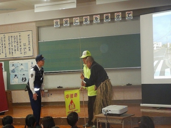劇は、玉手箱を開けてしまった浦島太郎のその後のお話で、玉手箱を開けておじいさんになった浦島太郎が認知症になり、道に迷ったところをいろいろな人が協力し、無事に家へ帰るというお話です。オリジナルの劇では、明治校区の風景がスクリーンで写し出される中、明治小の5年生や見守り隊の方、大正町交番の警察官の方などが登場し、子供達は劇の内容を身近に感じることができました。