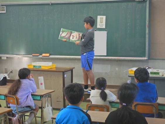 本に親しむのにとてもよい季節となりました。 秋の読書週間の取組の一つに図書委員さんによる絵本の読み聞かせがあります。 11月7日の朝の時間に1,2,3年生、かがやき学級で図書委員さんが絵本を読んでくれました。読み終わると読書週間の取組「図書館クイズ」のお知らせや「本をたくさん読みましょう」の呼びかけもしていました。 たくさん本を借りて、お気に入りの本を見つけられるといいなと思います。