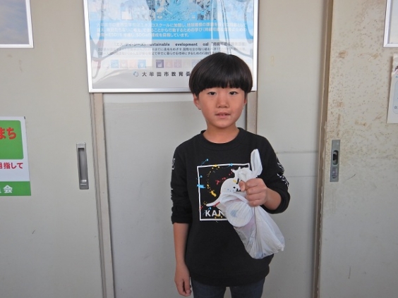 「登校時にゴミを見つけたから、家からビニール袋を持ってきて拾った」「学校の運動場のゴミを拾いました」「友達がしていたから、自分もしようと思って」と拾ったゴミを見せてくれました。