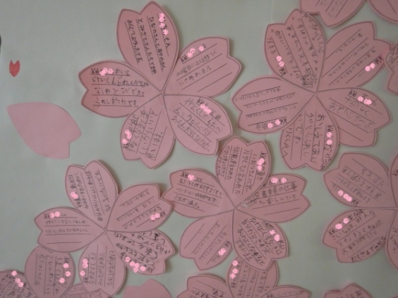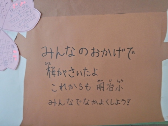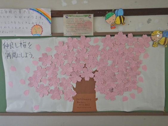 一つは、「桜の花に校歌を聞かせたい」という昨年度の思いから、給食時間に校歌を放送する。二つは、一人一枚桜の花びらの形をしたカードに「仲良くしてよかったこと」などを記入してもらい、それを貼って桜の木を完成させる。三つは校内にかくされた桜のカードを学級のみんなで協力してさがし、そこに書いてある文字を組み合わせて言葉を完成させる。というものでした。