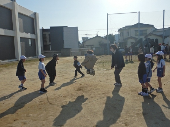 月曜の朝は、体を動かして元気に1週間を過ごそうという取り組みでワクワクタイムを実施しています。 今の時期は、大繩にチャレンジしています。縄の動きを怖がっていた1年生が、今では、大繩を回しても、タイミングよく入れる子が増えてきて、リズムよく跳べるようになってきました。 3年生は、目標の100回跳ぶことができて、みんなで大喜びしていました。 まだ、少し肌寒い朝ですが、みんな元気に過ごしてほしいです。
