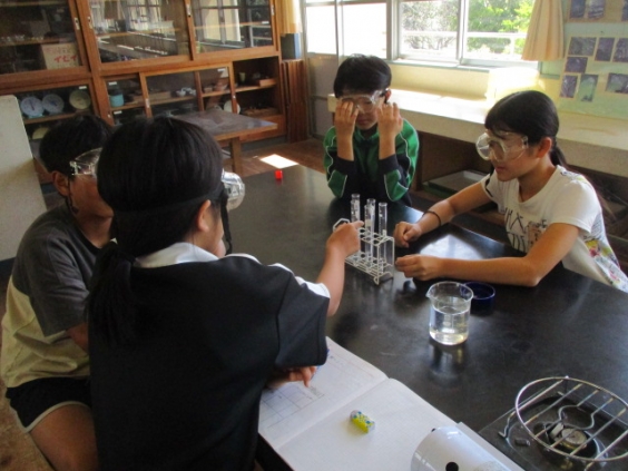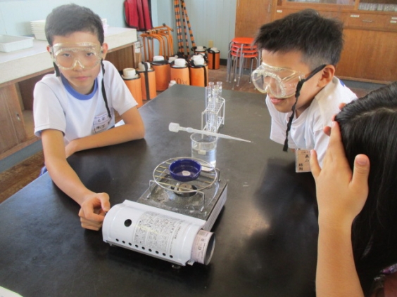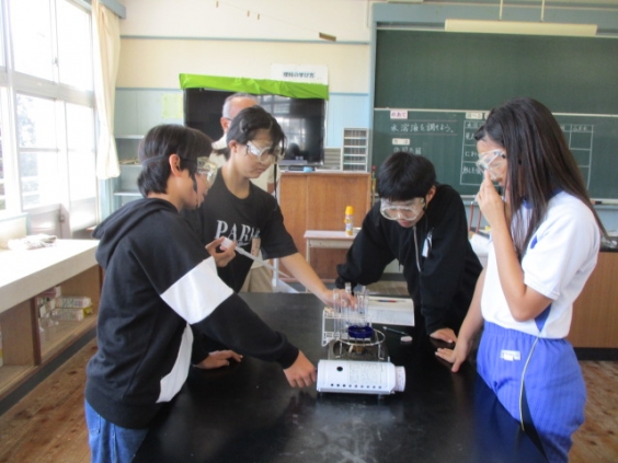 6年生は、理科の学習で水溶液を調べる実験をしました。 グループごとに、試験官に入った食塩水、炭酸水、アンモニア水、塩酸、石灰水を、見た目と匂いと熱して蒸発させることで調べました。 安全面で大切な約束を確認した後、子ども達は緊張した表情で注意深く、協力して実験しました。炭酸水は泡が出る。アンモニア水はツンと匂う、蒸発したら食塩水や石灰水は白い個体が残るなど、実験を通して分かったことを記録していました。 子ども達は、真剣にとても興味をもって実験を楽しんでいました。