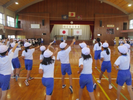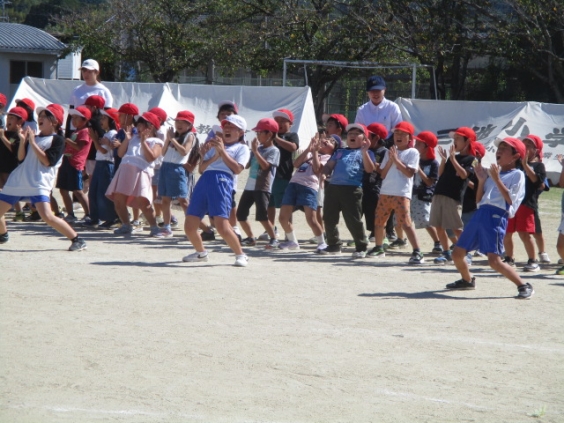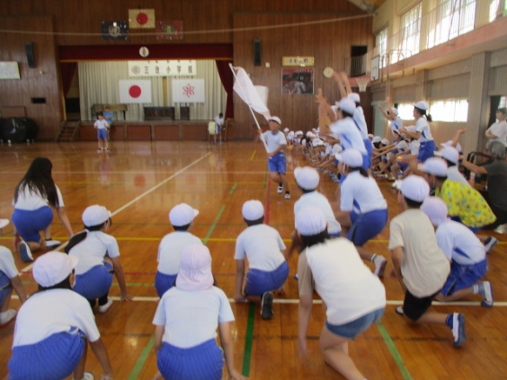 紅組、白組が、それぞれ運動場や体育館に別れて全体練習をしました。 タイミングや角度を合わせたり、素早く隊形移動したり、全体の動きを何度も練習しました。太鼓のリズムに合わせて、声を張り上げる子ども達、応援団の声にしっかりと答えようと頑張る姿。紅組も白組も必死に競り合って、少ない日数でめきめきと迫力が出てきました。 顔を真っ赤にして力を出し切った子ども達は、練習が終わった後「すっごい声出した。」「のど痛い〜。」など言いながらも、とても誇らしげでした。