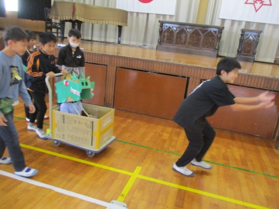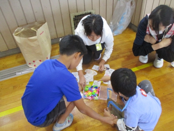 4年生は、総合の学習でりんどう学園と、交流活動を行いました。子ども達は「みんなの笑顔のために、私たちができること」を意識して、相手意識をもって自分たちに何ができるか考えて準備をしてきました。 ボーリング、紙飛行機、ぬりえ、輪投げ、積み木、大蛇山ごっこなど、興味を引くようにカラフルにしたり、折り紙やシールなどの景品をつけたり、工夫をこらしたゲームや遊びがたくさんありました。 りんどう学園の子ども達が喜ぶ姿に、満足そうな4年生でした。
